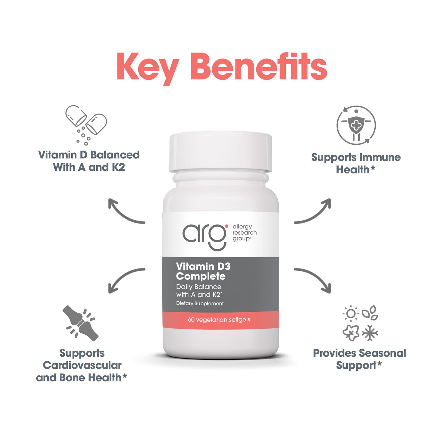 Vitamin D3 Complete is formulated to respect the crucial importance of balancing vitamin D with vitamin A.* It also contains the other oil-soluble vitamins, K2 (menaquinone-7) and DeltaGOLD® tocotrienols (part of the vitamin E family). Vitamin D3 Complete is formulated for safe, long-term daily supplementation for most individuals.*